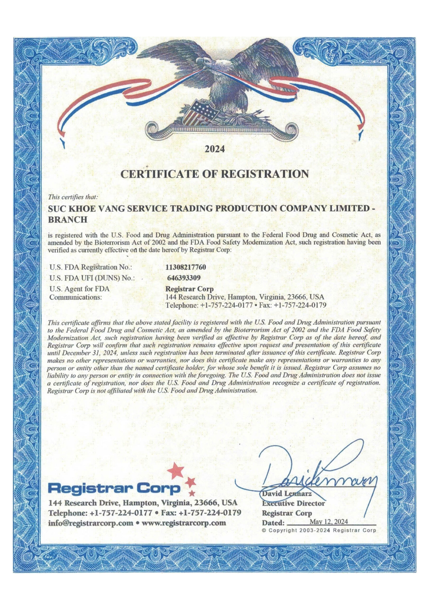 Chứng nhận FDA của nhà máy Sức Khoẻ Vàng – Yến sào Thiên Triều