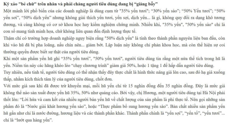 Nhiều vụ việc sản xuất yến giả, dùng hóa chất tạo mùi, hoặc độn các nguyên liệu như mủ trôm, nấm tuyết để tăng độ sánh đã bị cơ quan chức năng phát hiện. Đáng lo ngại hơn, các sản phẩm nước yến lon, hũ hiện nay đều do nhà sản xuất tự công bố hàm lượng yến, không qua kiểm chứng độc lập, gây ra hiểu lầm nghiêm trọng về giá trị dinh dưỡng thực sự.
